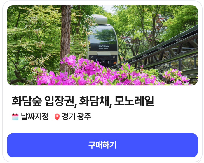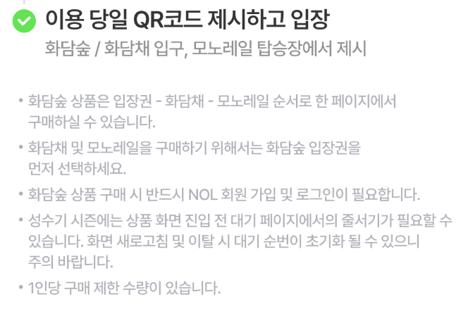 - 입장권은 필수 예매 항목이며, 모노레일 및 화담채 이용권은 선택 예매입니다.