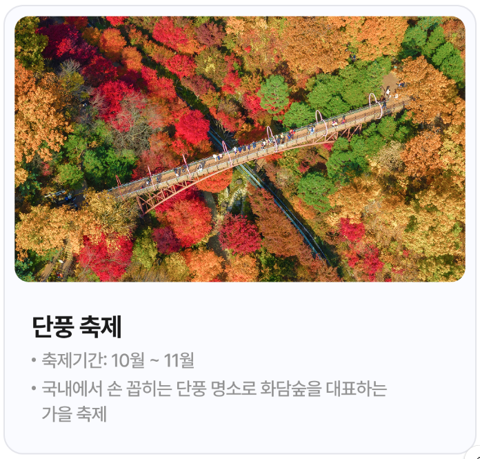 - 가을: 단풍 절경, 예약 경쟁 치열.
