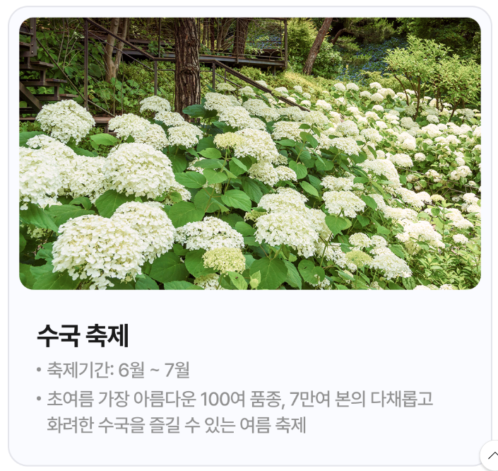 - 봄: 벚꽃, 철쭉 등 꽃 구경, 예약 조기 마감 주의.